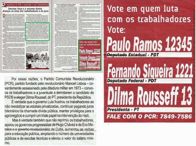 [1] Retirado de panfleto distribuído pelo PCR durante a campanha de Dilma Rousseff à Presidência da República do Brasil em 2010 – https://archive.org/download/VoteDilma/voteDilma.jpg